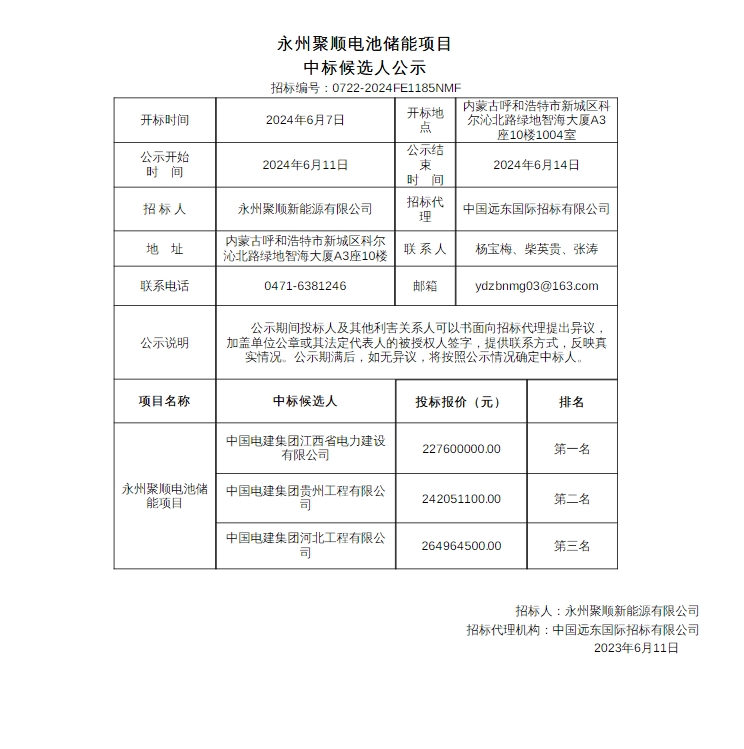 据储能界了解到,6月11日,永州聚顺电池储能项目中标候选人公示发布。