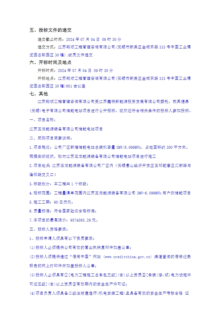 据储能界了解到,6月11日,江苏玉龙能源装备有限公司储能电站项目招标公告发布。