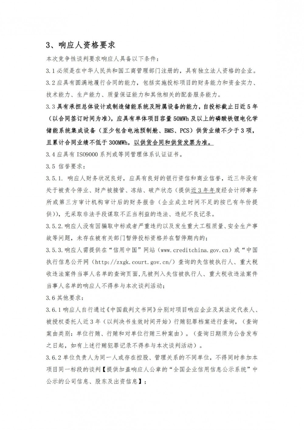 投标人需具有承担总体设计或制造储能系统及附属设备的能力,自投标截止日近5年(以合同签订时间为准),应具有单体项目容量50MWh及以上的磷酸铁锂电化学储能系统集成设备(至少包含电池预制舱、BMS、PCS)供货业绩不少于3项,且累计合同业绩不低于300MWh。