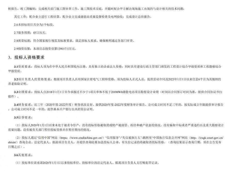 投标人自2018年1月1日至今承接过不少于1项且单体不低于200MWh储能电站项目勘察设计业绩。