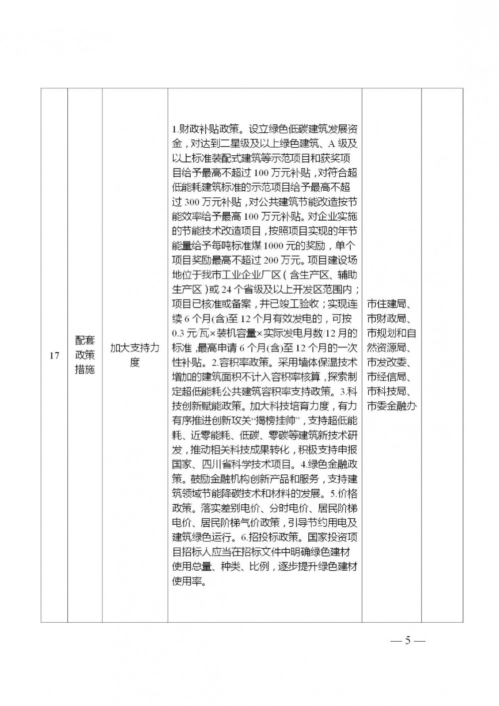 3. 科技创新赋能政策。加大科技培育力度,有力有序推进创新攻关“揭榜挂帅”,支持超低能耗、近零能耗、低碳、零碳等建筑新技术研发,推动相关科技成果转化,积极支持申报国家、四川省科学技术项目。