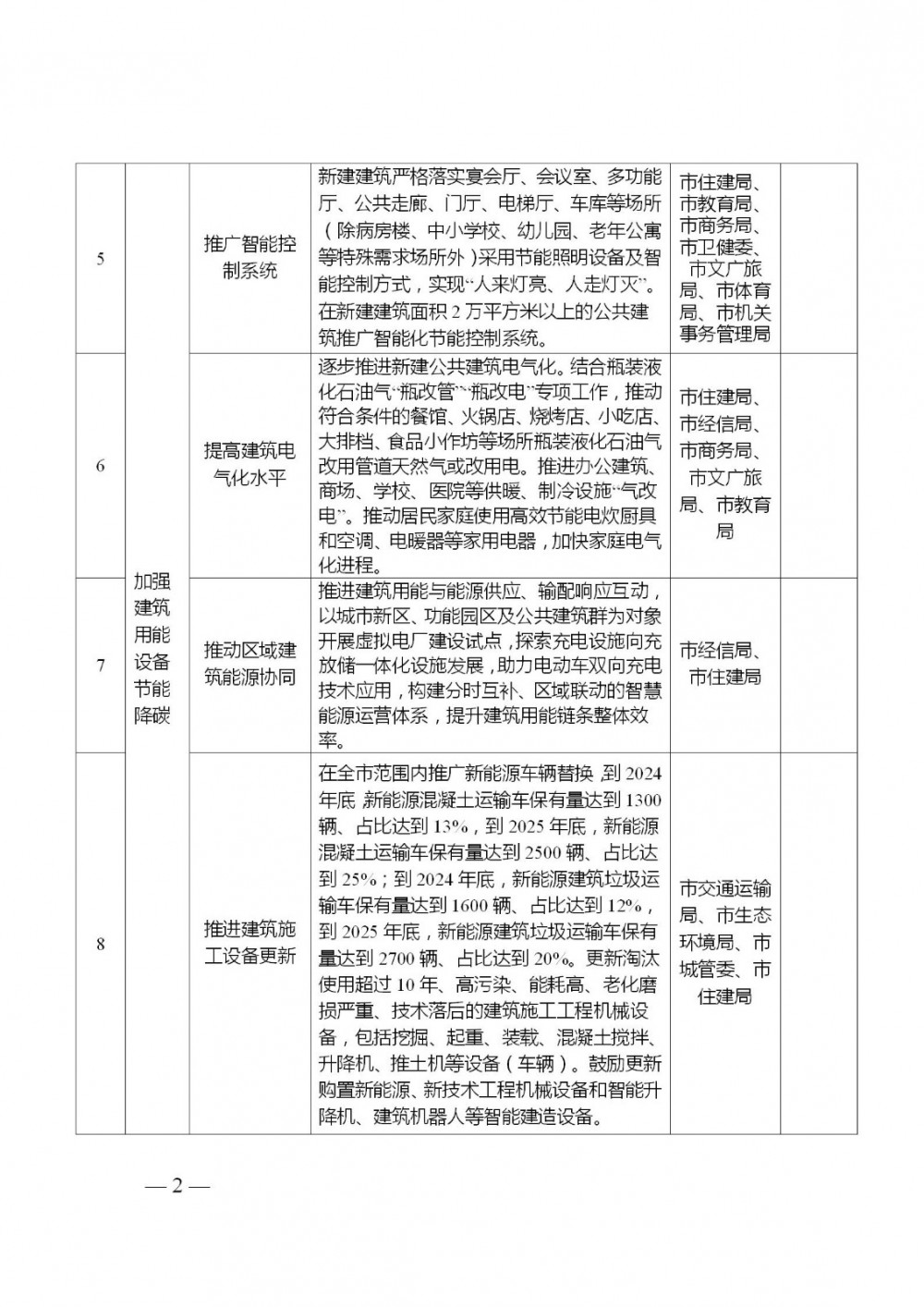 (七)推进建筑施工设备更新。在全市范围内推广新能源车辆替换,到2024年底,新能源混凝土运输车保有量达到1300辆、占比达到13%,到2025年底,新能源混凝土运输车保有量达到2500辆、占比达到25%;到2024年底,新能源建筑垃圾运输车保有量达到1600辆、占比达到12%,到2025年底,新能源建筑垃圾运输车保有量达到2700辆、占比达到20%。更新淘汰使用超过10年、高污染、能耗高、老化磨损严重、技术落后的建筑施工工程机械设备,包括挖掘、起重、装载、混凝土搅拌、升降机、推土机等设备(车辆)。鼓励更新购置新能源、新技术工程机械设备和智能升降机、建筑机器人等智能建造设备。