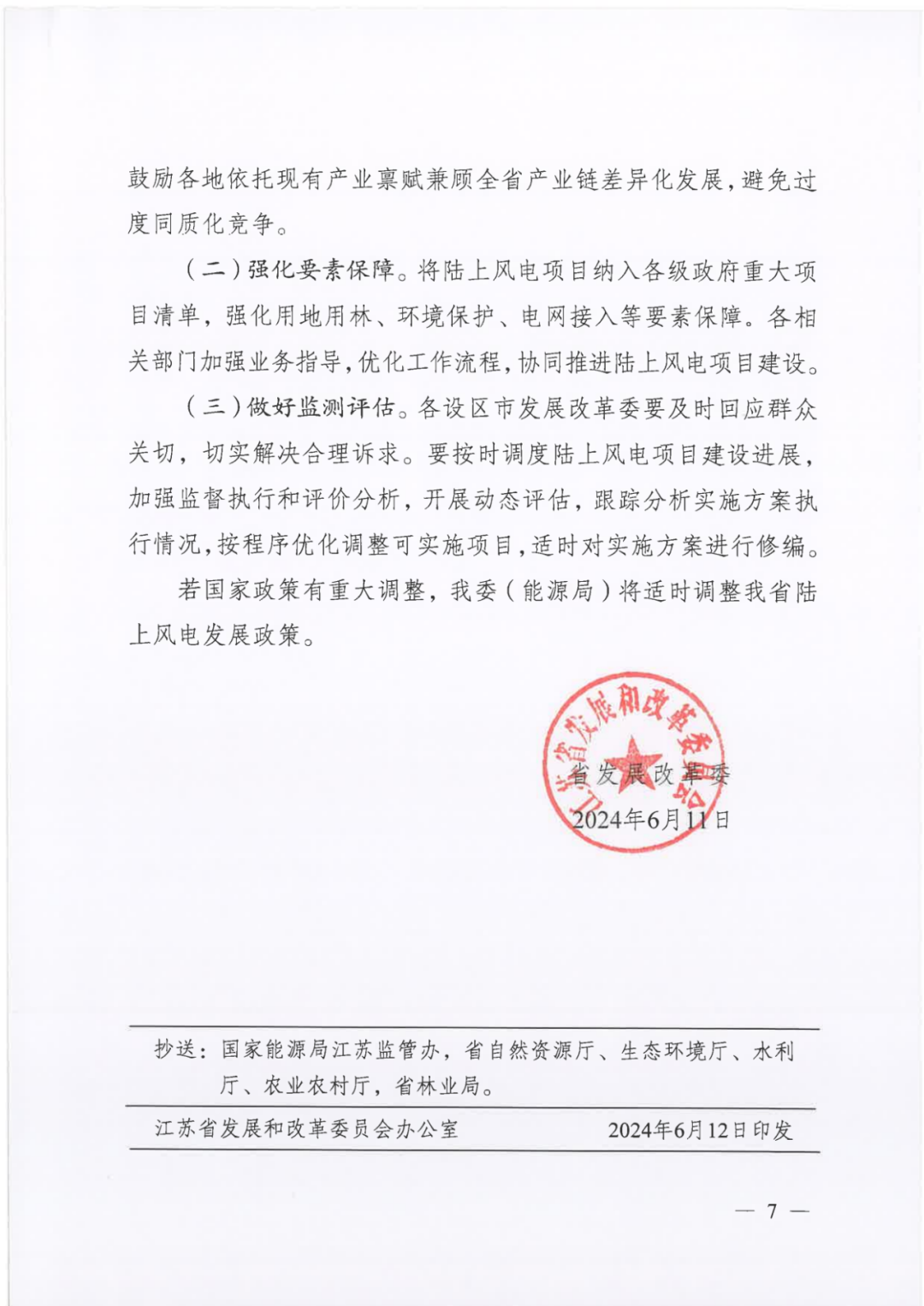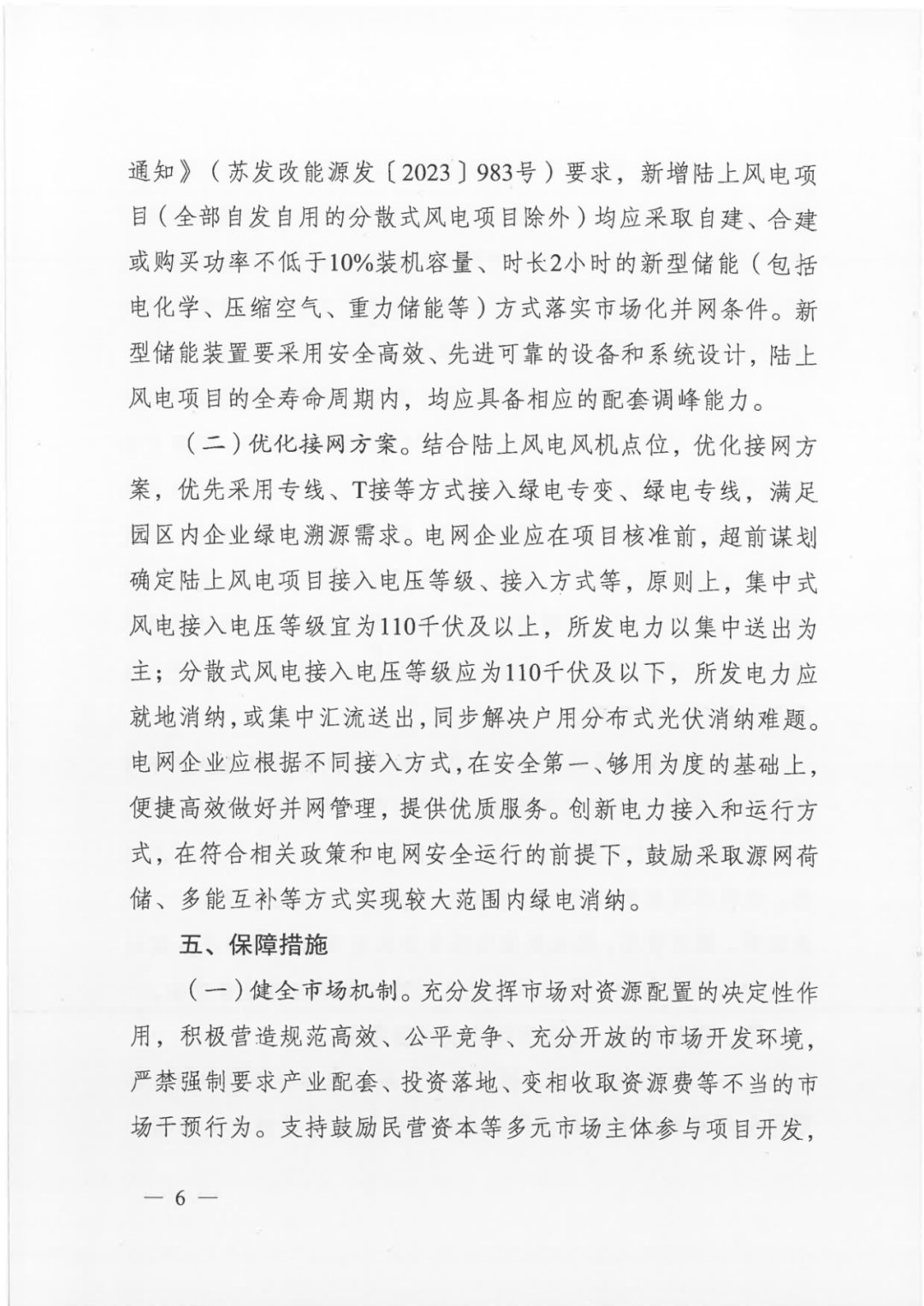 《通知》明确落实储能配置。按照《省发展改革委关于进一步做好可再生能源发电市场化并网项目配套新型储能建设有关事项的通知》(苏发改能源发(2023】983号)要求,新增陆上风电项目(全部自发自用的分散式风电项目除外)均应采取自建、合建或购买功率不低于10%装机容量、时长2小时的新型储能(包括电化学、压缩空气、重力储能等)方式落实市场化并网条件。