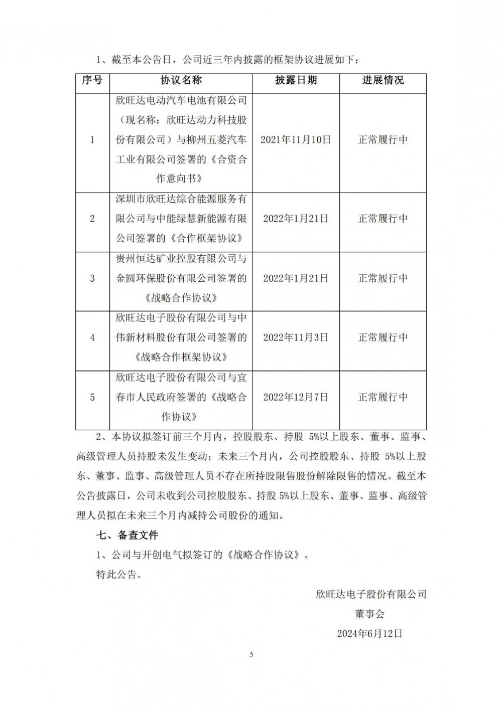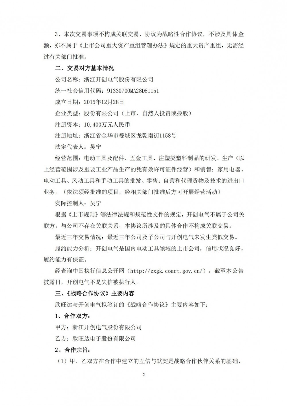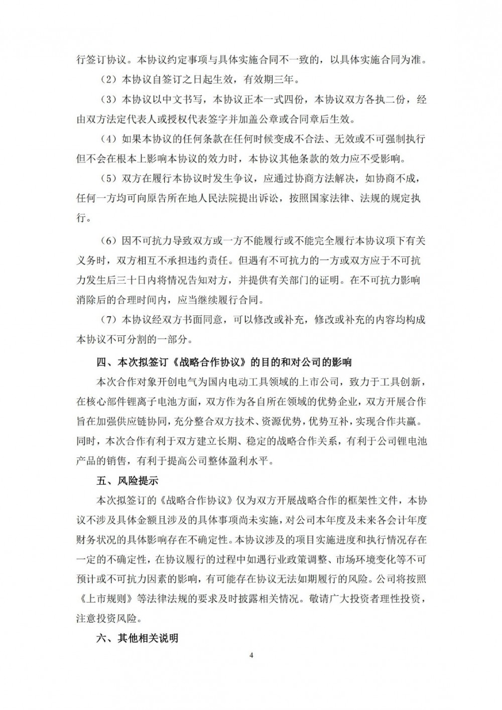 欣旺达表示,本次合作对象开创电气为国内电动工具领域的上市公司,致力于工具创新,在核心部件锂离子电池方面,双方作为各自所在领域的优势企业,双方开展合作旨在加强供应链协同,充分整合双方技术、资源优势,优势互补,实现合作共赢。同时,本次合作有利于双方建立长期、稳定的战略合作关系,有利于公司锂电池产品的销售,有利于提高公司整体盈利水平。