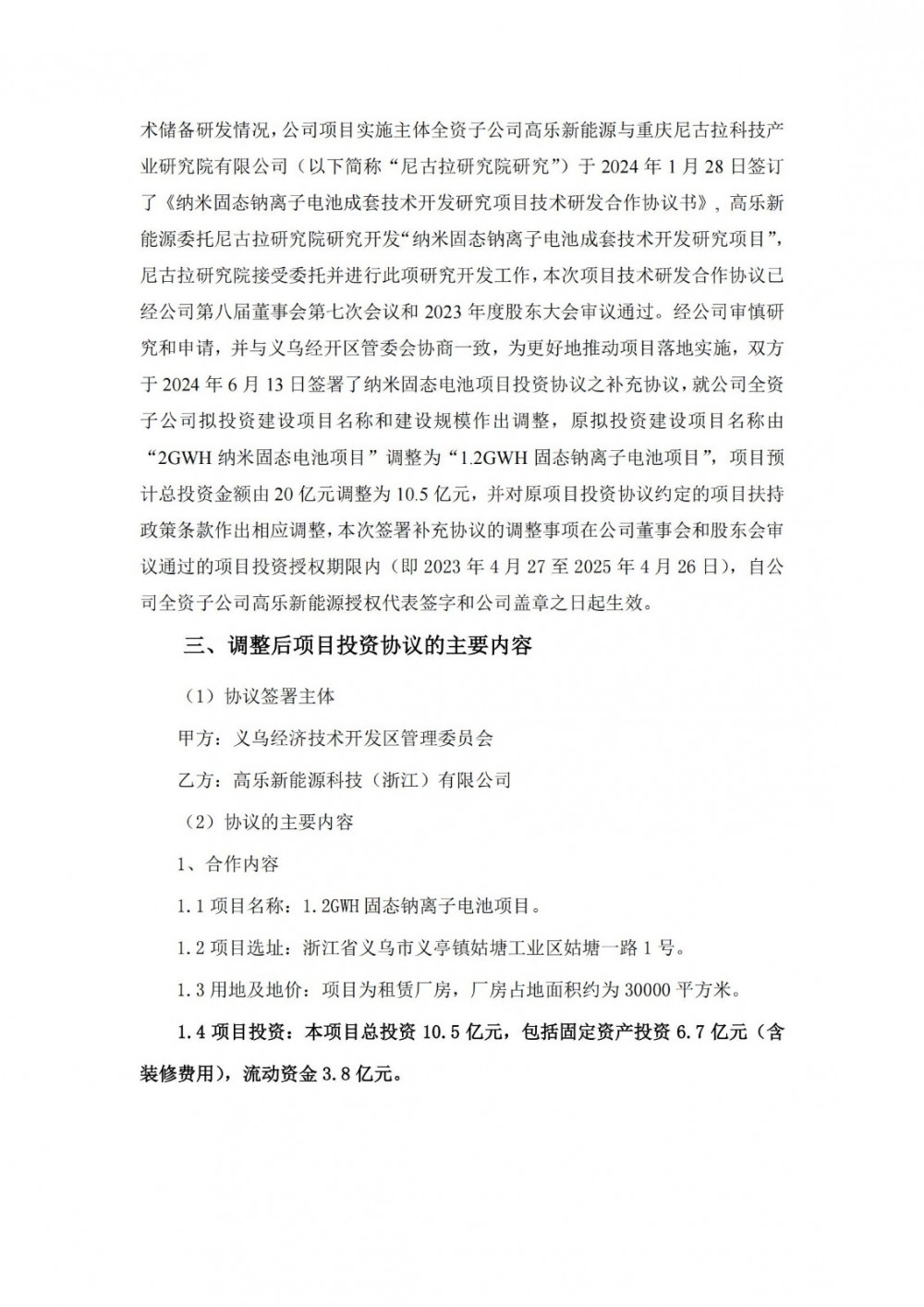 据储能界了解到,6月14日,高乐股份发布公告称,为更好地推动项目落地实施,高乐股份与义乌经开区管委会协商一致,双方于2024年6月13日签署了纳米固态电池项目投资协议之补充协议,就公司全资子公司拟投资建设项目名称和建设规模作出调整。