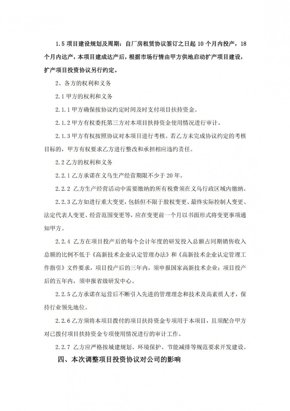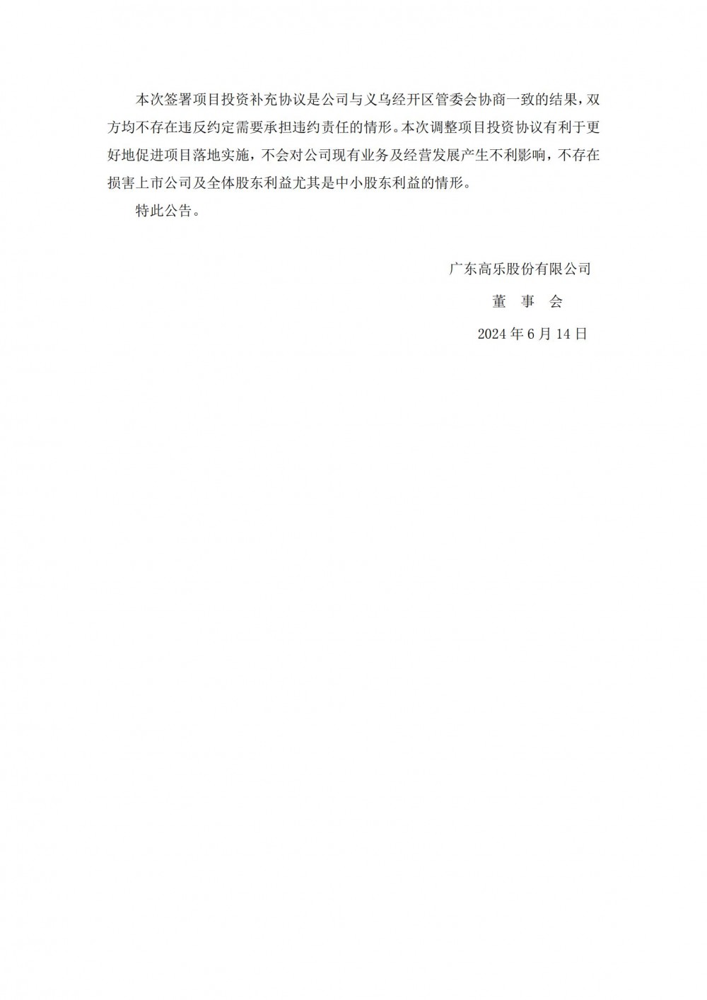 高乐股份表示,本次签署项目投资补充协议是公司与义乌经开区管委会协商一致的结果,双方均不存在违反约定需要承担违约责任的情形。本次调整项目投资协议有利于更好地促进项目落地实施,不会对公司现有业务及经营发展产生不利影响,不存在损害上市公司及全体股东利益尤其是中小股东利益的情形。