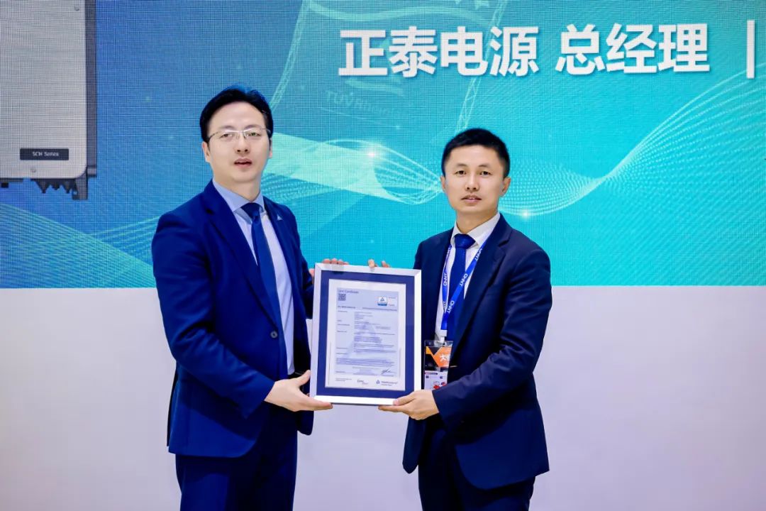 展会期间, 在一众来宾的见证下,CSA集团区域副总裁兼中国区总经理葛延青为正泰电源的美版12kW户储变流器颁发UL全系列证书。TUV莱茵全球电力电子产品服务副总裁兼大中华区太阳能与商用产品服务总经理李卫春,为我们350KW系列颁发德国VDE 4110/4120证书。这些认证不仅体现了我们产品的卓越品质和安全性能,也标志着我们在国际市场上的竞争力和认可度进一步提升。此外,两位颁奖嘉宾向正泰电源表示祝贺,并就双方未来深化合作提出了期许。