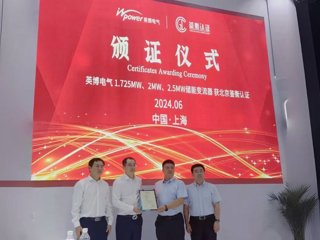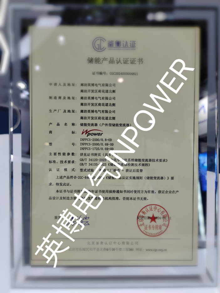 值得一提的是,在本次展会上,英博电气1.725MW、2MW、2.5MW储能变流器成功获得了北京鉴衡认证中心认证。这一认证标志着英博电气的产品已经符合了最新的国家标准《电化学储能系统储能变流器技术要求》(GB/T34120-2023)和《储能变流器检测技术规程》(GB/T34133-2023),进一步证明了英博电气在储能技术领域的标杆企业地位。